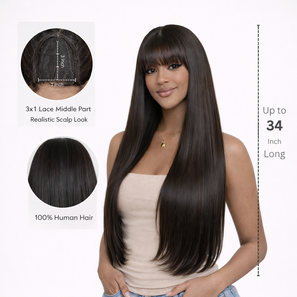 Ultra-sleek, ultra-polished — this bone straight wig with bangs gives you that fresh-from-the-salon look with zero effort. The 3x1 machine-made construction features a realistic scalp appearance at the middle part, so it looks natural without any lace customization. Just put it on and go.