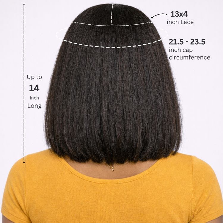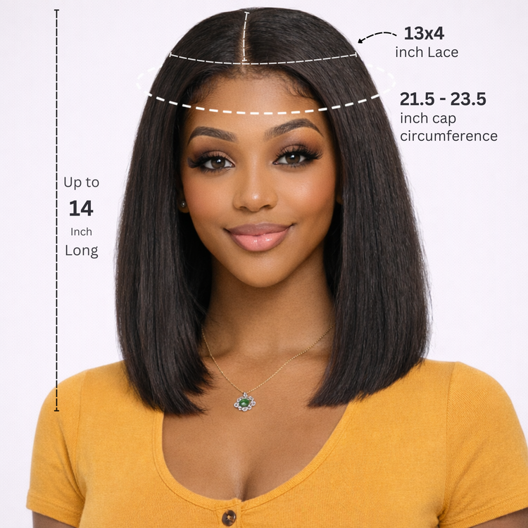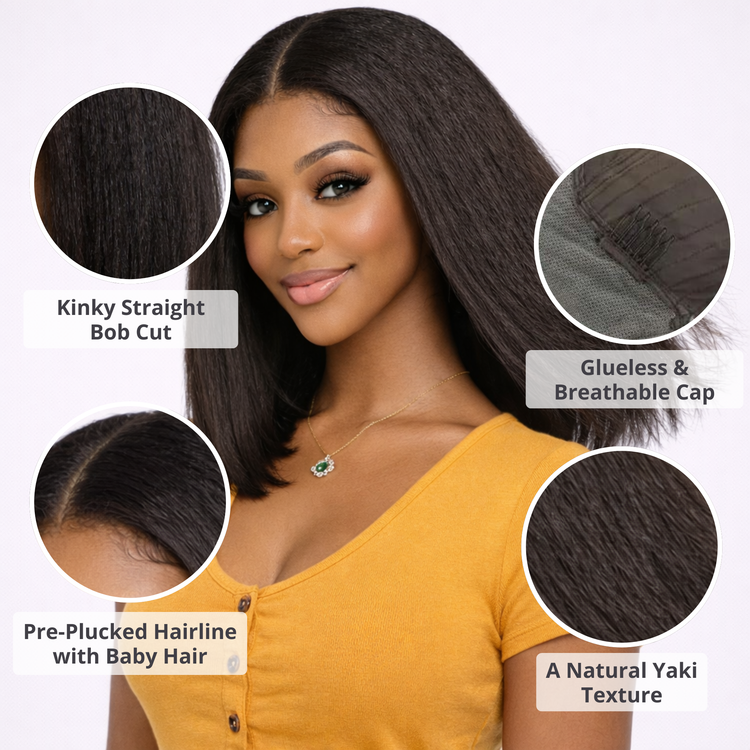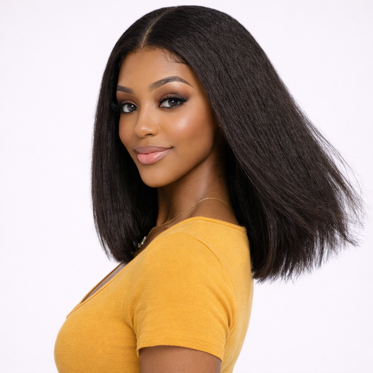That natural, just-relaxed bob — this kinky straight wig combines yaki texture with a clean bob cut for a look that's polished yet effortlessly real. Available in two density options, and the 13x4 lace front gives you a natural hairline with flexible parting options.